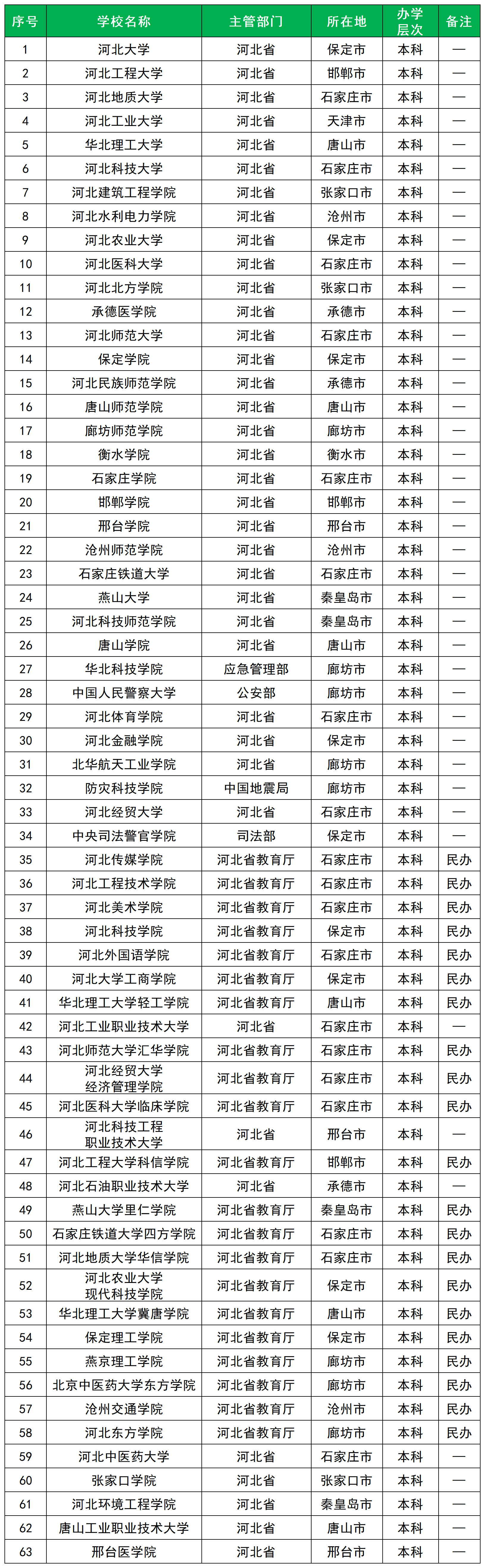 河北省内的本科大学有63所,实力较强的本科大学有河北工业大学(虽然位于天津市,但其主管部门是河北省,所以我们仍将河北工业大学这所211院校视为河北的高校)、华北理工大学、河北师范大学、燕山大学、河北大学等院校。