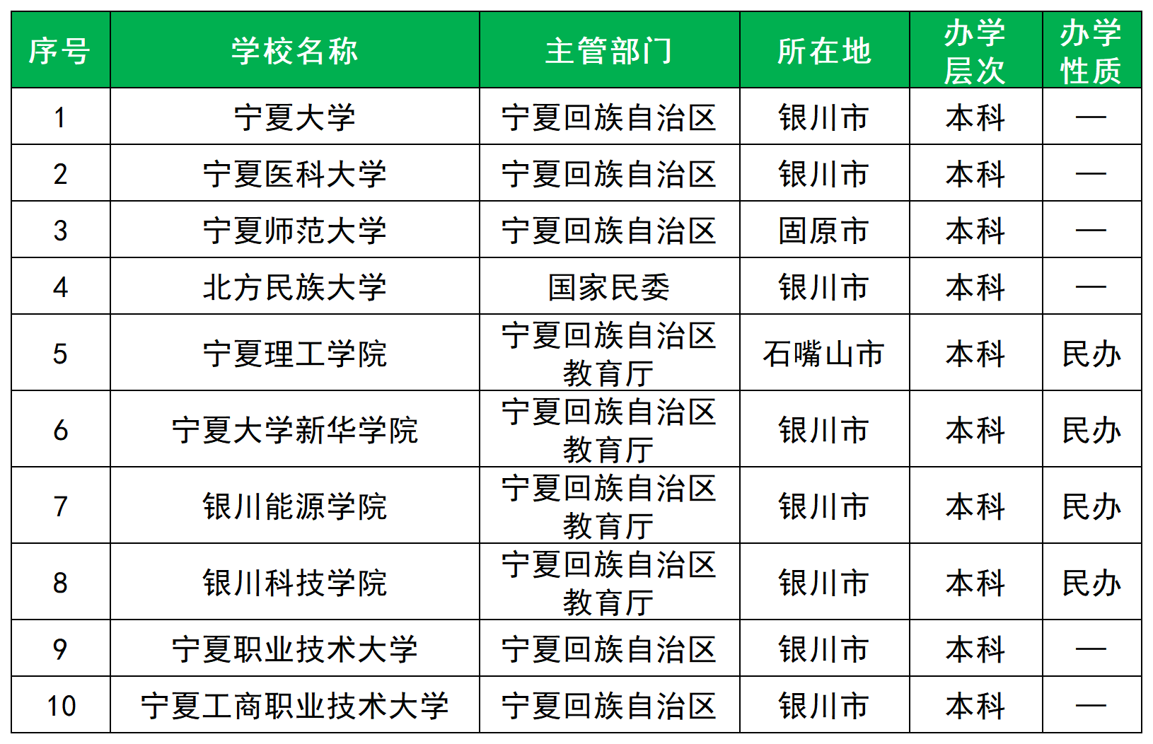 宁夏共有10所本科大学,截止2025年6月20日,宁夏的本科大学名单整理如下,供大家参考。