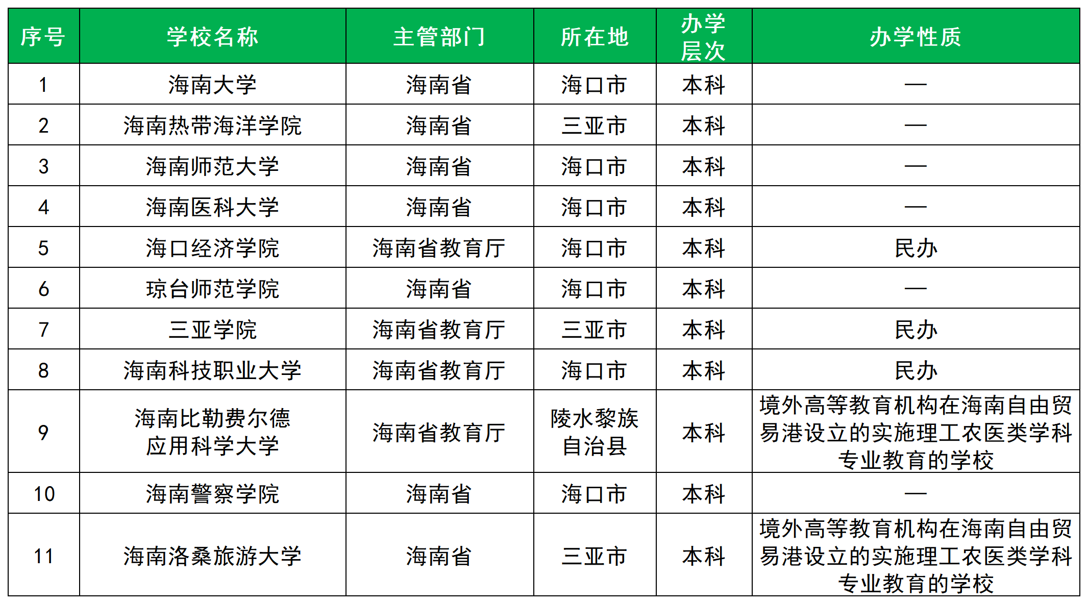 海南共有11所本科大学,其中有1所211大学——海南大学。