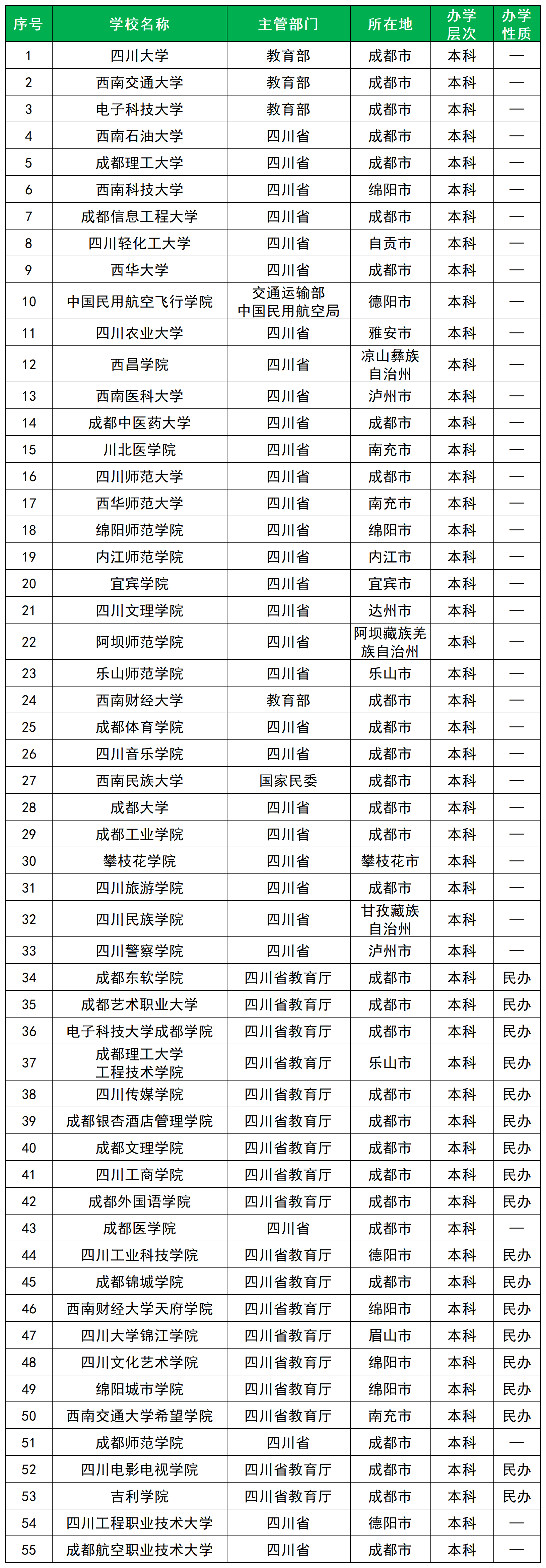 四川省内有55所本科大学,实力最强的是四川大学、电子科技大学,这是省内唯二的985大学。其余实力较强的本科院校还有四川农业大学、西南交通大学、西南财经大学、成都理工大学等院校。