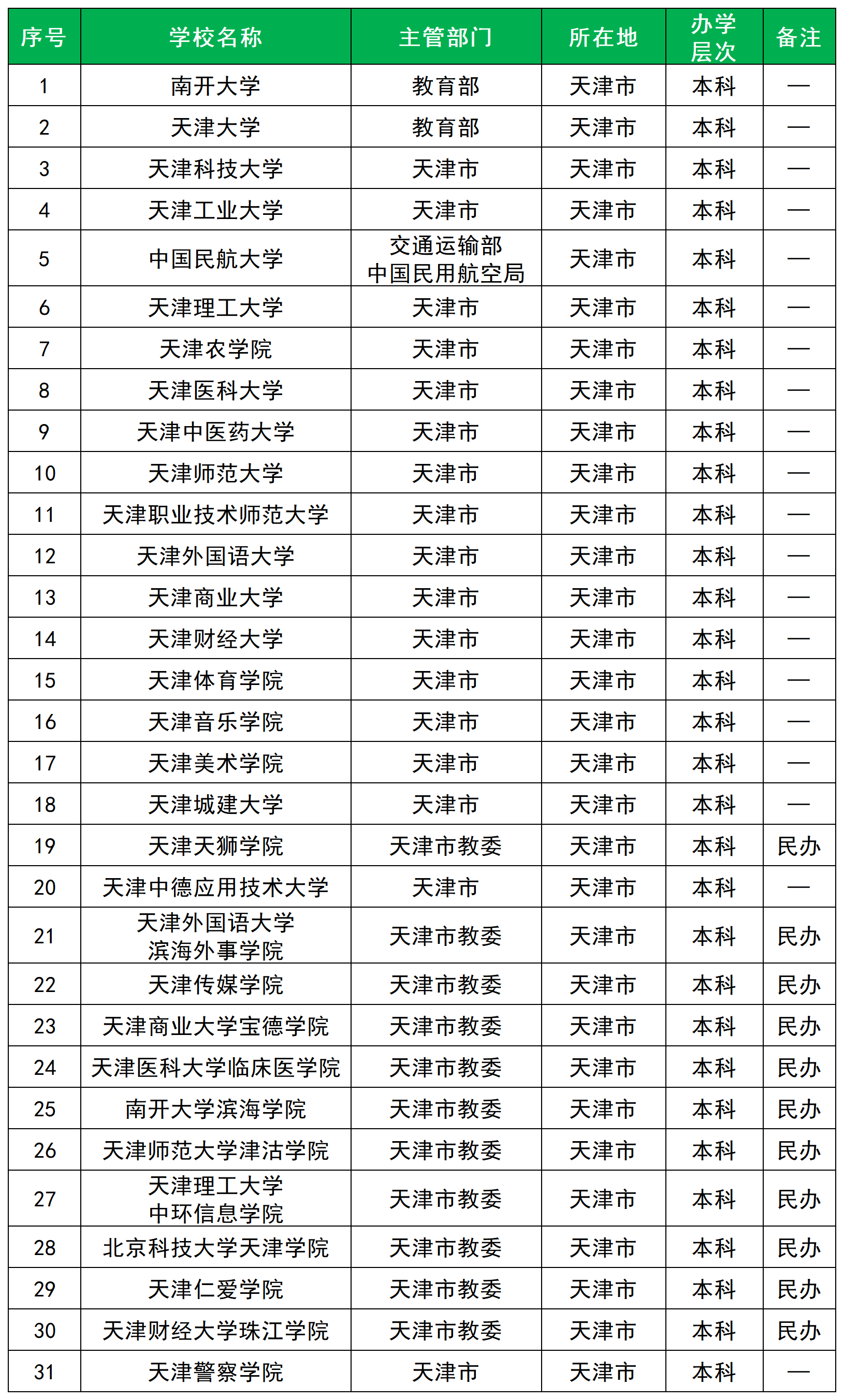 天津市内有31所本科大学,拥有南开大学、天津大学等985名校。