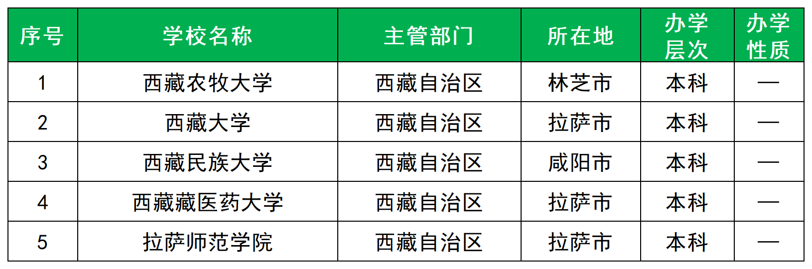 西藏共有5所本科大学,虽然西藏民族大学在陕西省咸阳市,但由于学校的主管部门是西藏自治区,所以我们默认其为西藏的大学。截止2025年6月20日,西藏的本科大学名单整理如下,供大家参考。