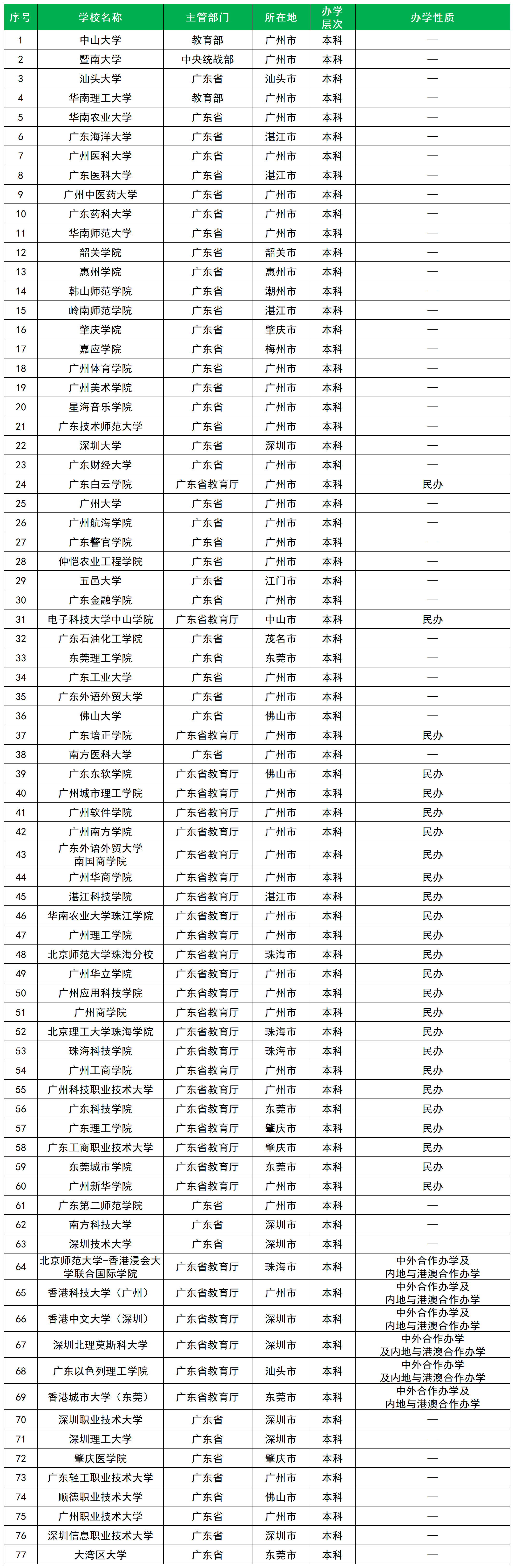 广东省内有77所本科大学,作为华南经济强省,广东省的高等教育资源同样比较丰富,知名度较高、实力较强的大学有中山大学、华南理工大学、华南师范大学、汕头大学、暨南大学等院校。