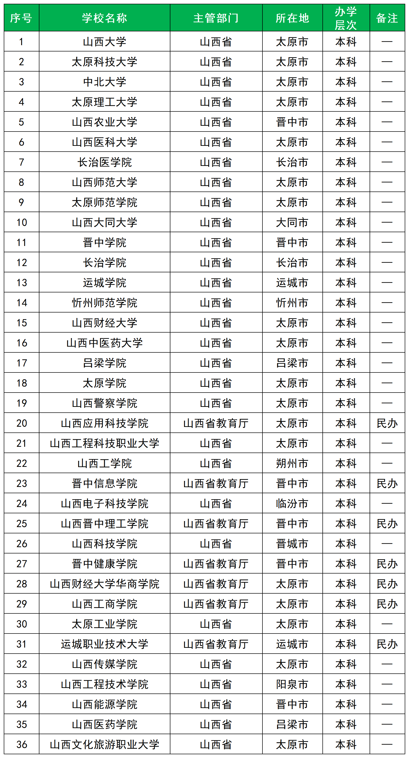 山西省内有36所本科大学,实力最强的院校有山西大学、太原理工大学、中北大学、山西医科大学等院校。
