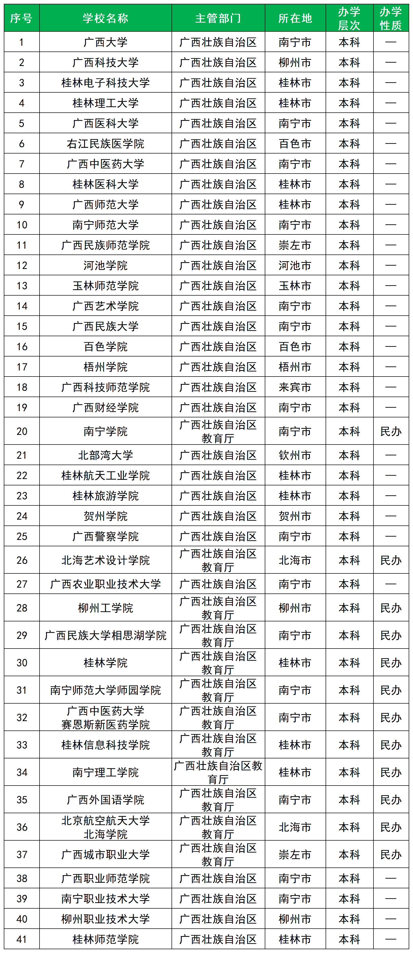 广西区内有41所本科大学,截止2025年6月20日,广西的本科大学名单整理如下,供大家参考。
