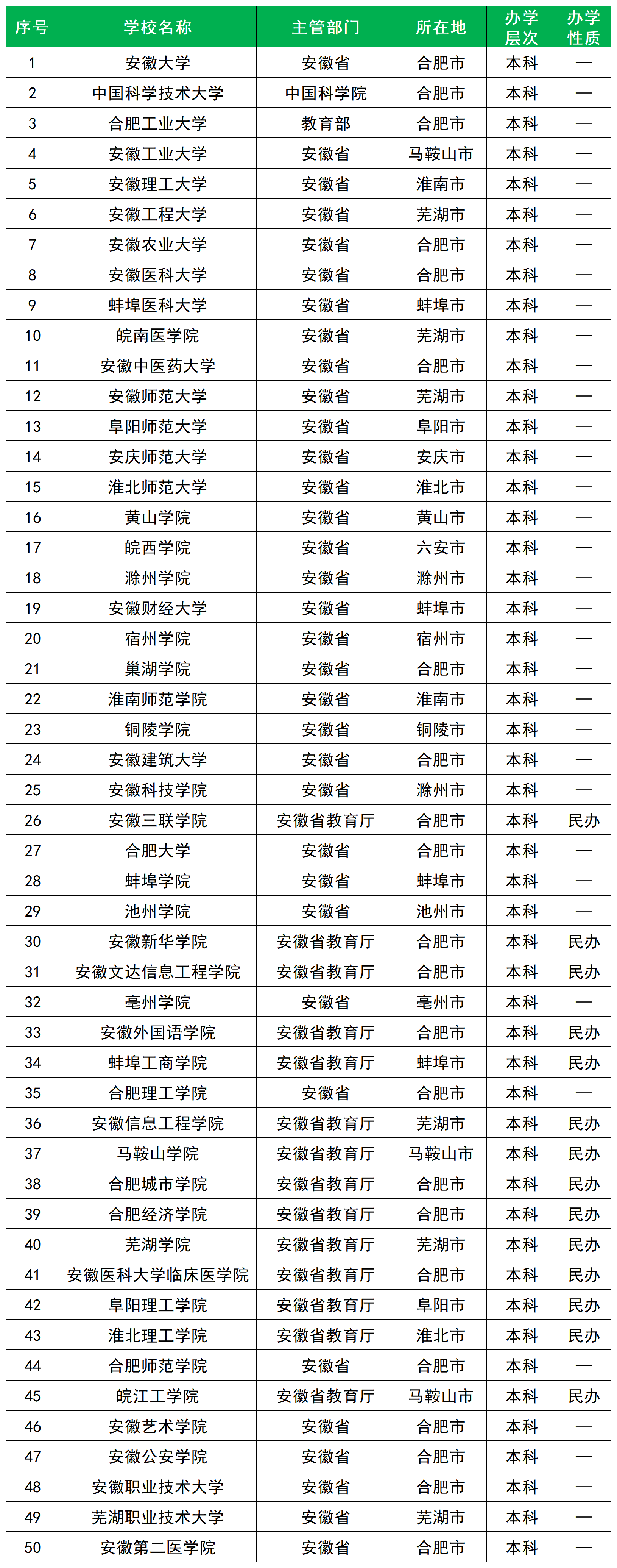 安徽省内有50所本科大学,省内知名度最高、实力较强的大学有安徽大学、合肥工业大学、中国科学技术大学等院校。