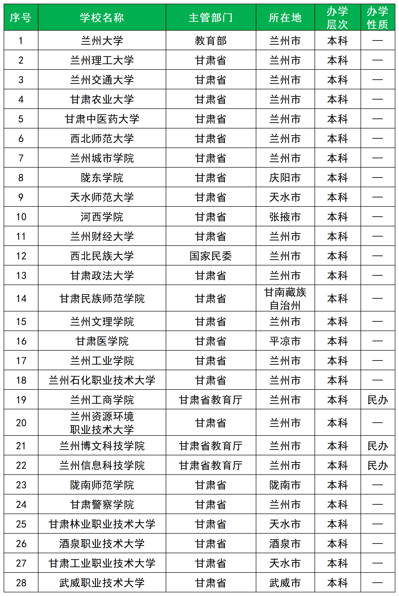 甘肃省内有28所本科大学,省内实力最强的是兰州大学,此外知名度较广、学科实力较强的本科大学还有兰州交通大学、西北师范大学等院校。