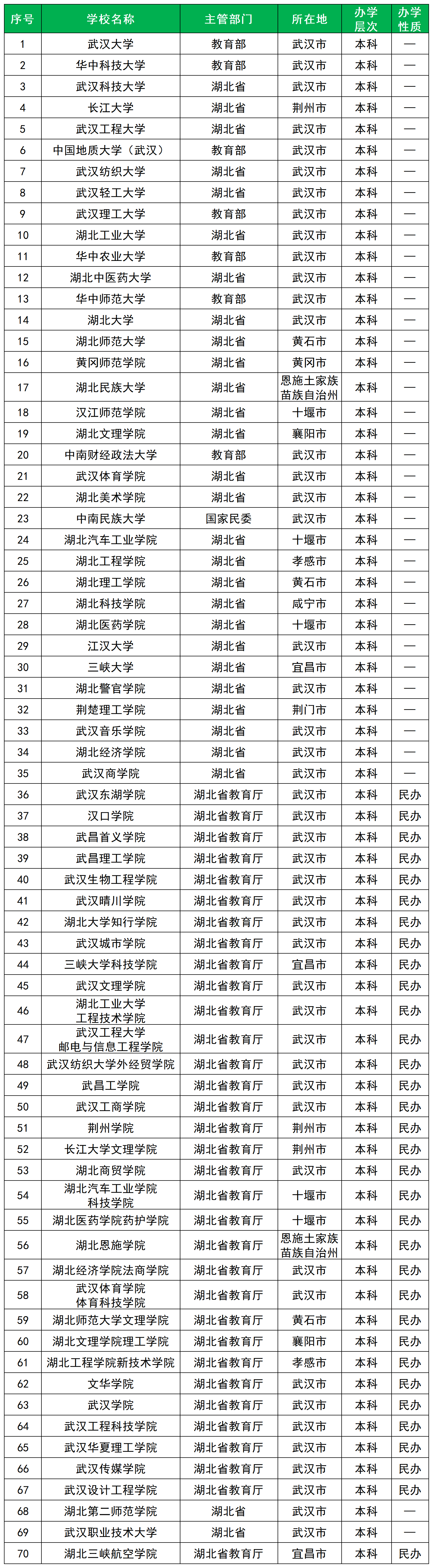 湖北省内共有70所本科大学,知名度较高、实力较强的大学有武汉大学、华中科技大学、中南财经政法大学等院校。