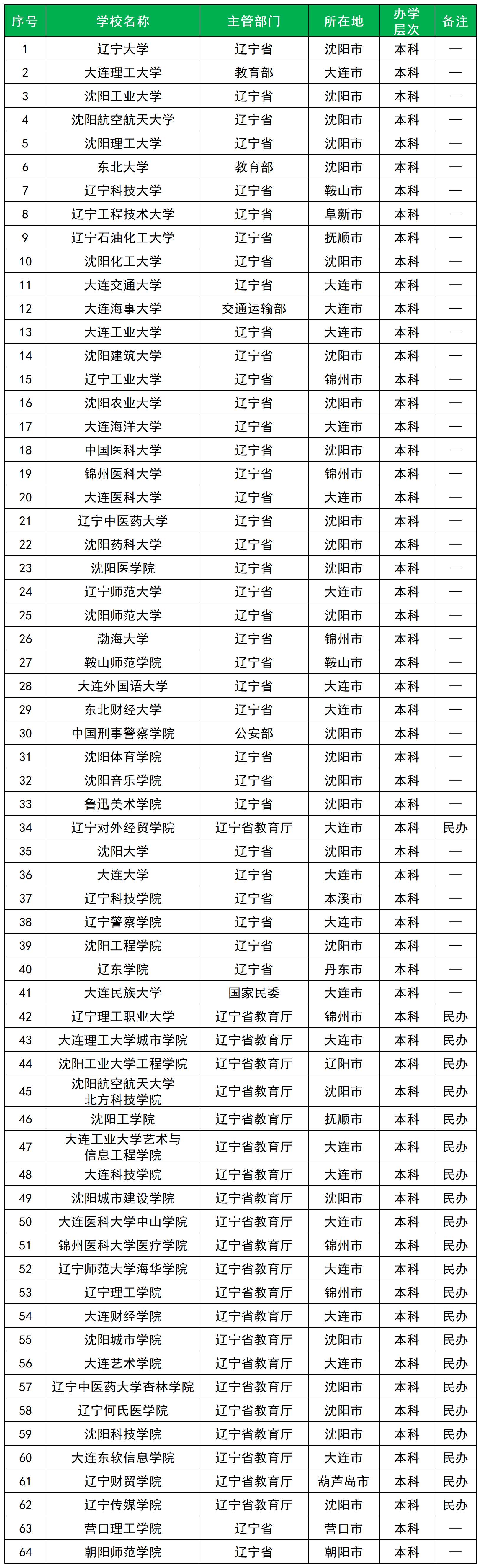 辽宁共有64所本科院校,辽宁省的高等教育资源也非常丰富,囊括了包括大连理工大学、东北大学在内的985大学,以及辽宁大学、大连海事大学等211院校。