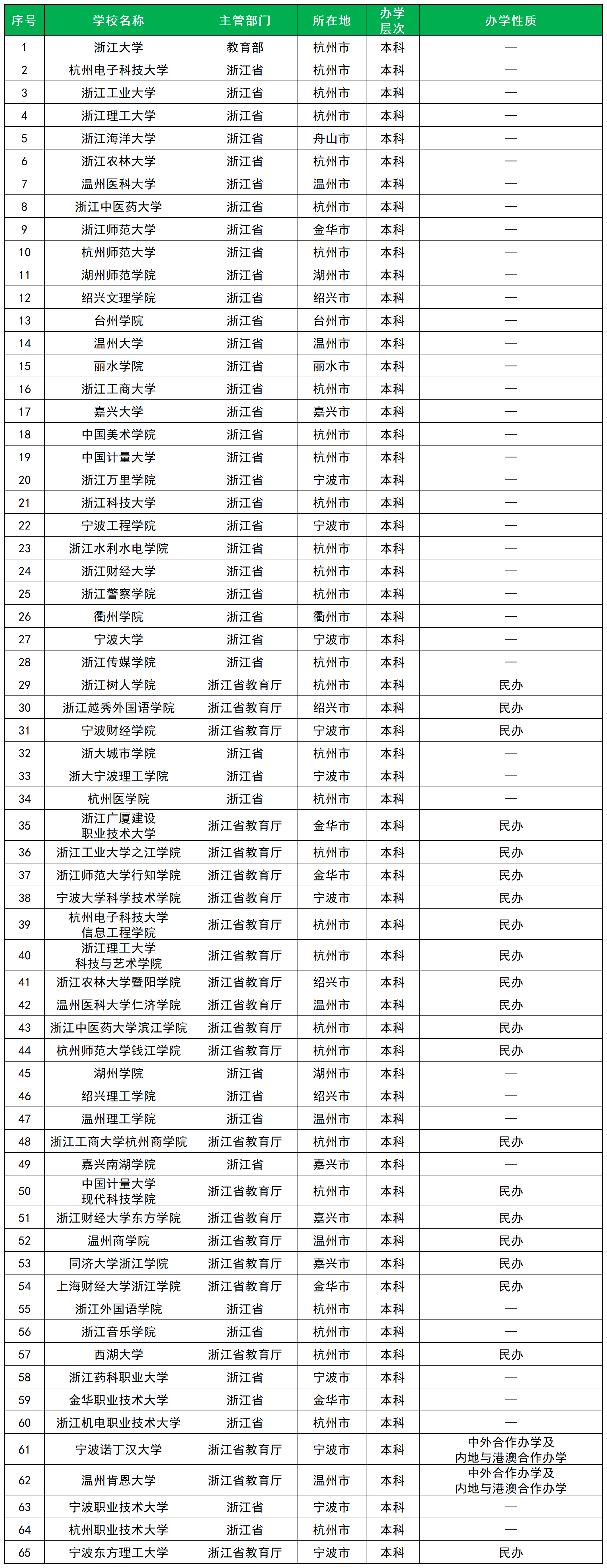 浙江省内有65所本科大学,同样处于东南沿海,省内仅有1所985大学——浙江大学。其余实力较强的大学有宁波大学、浙江工商大学、杭州电子科技大学、中国计量大学等院校。