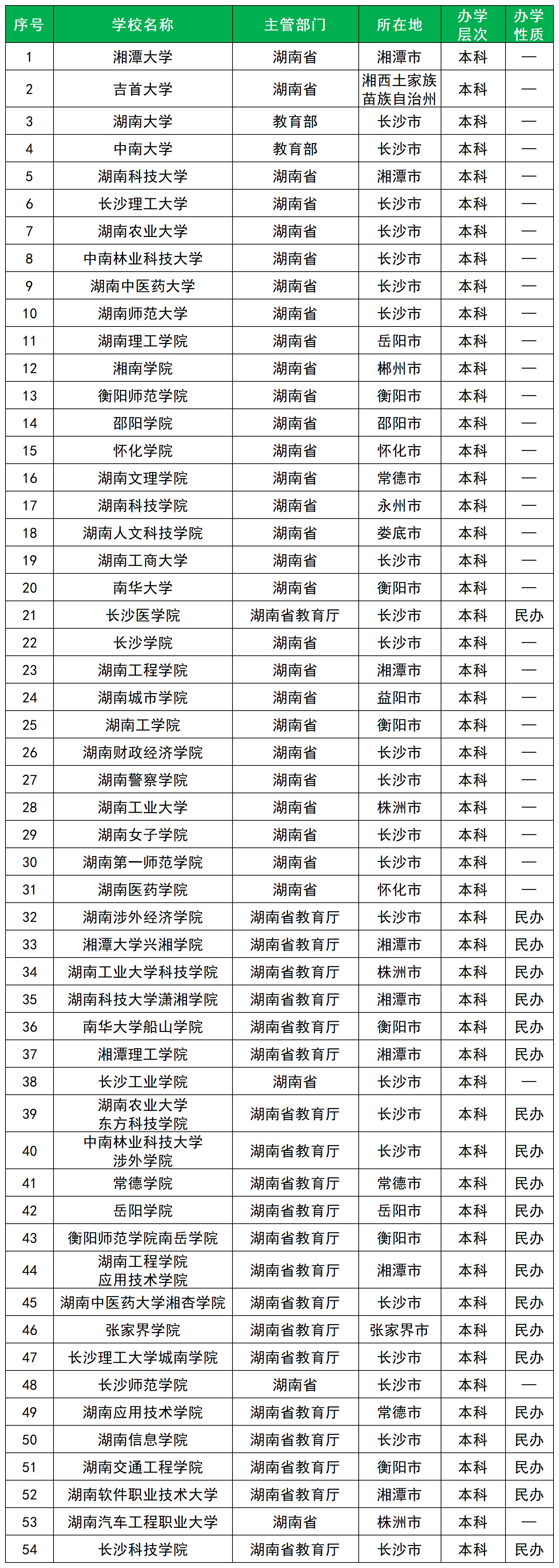 湖南省内共有54所本科大学,知名度较高、实力较强的大学有湖南大学、中南大学、国防科技大学、湘潭大学、湖南师范大学等院校。