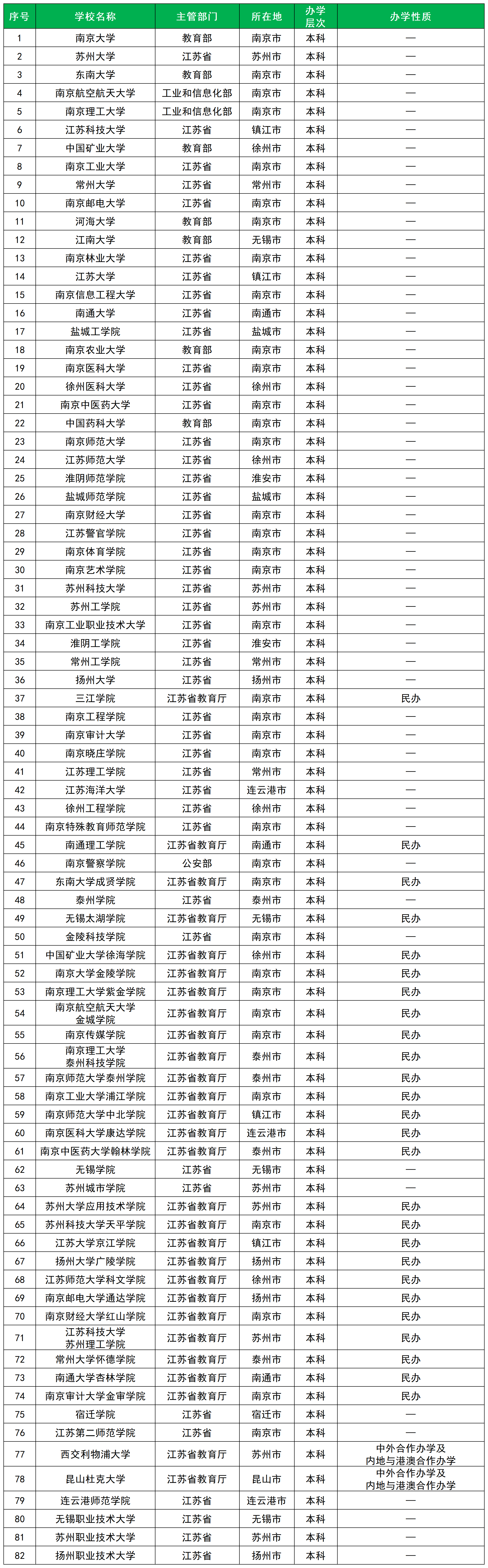 江苏省内有82所本科大学,教育资源同样非常丰富,其中知名度最高、办学实力最强的本科大学有南京大学、苏州大学、东南大学、河海大学、江南大学、南京理工大学、南京航空航天大学等院校。