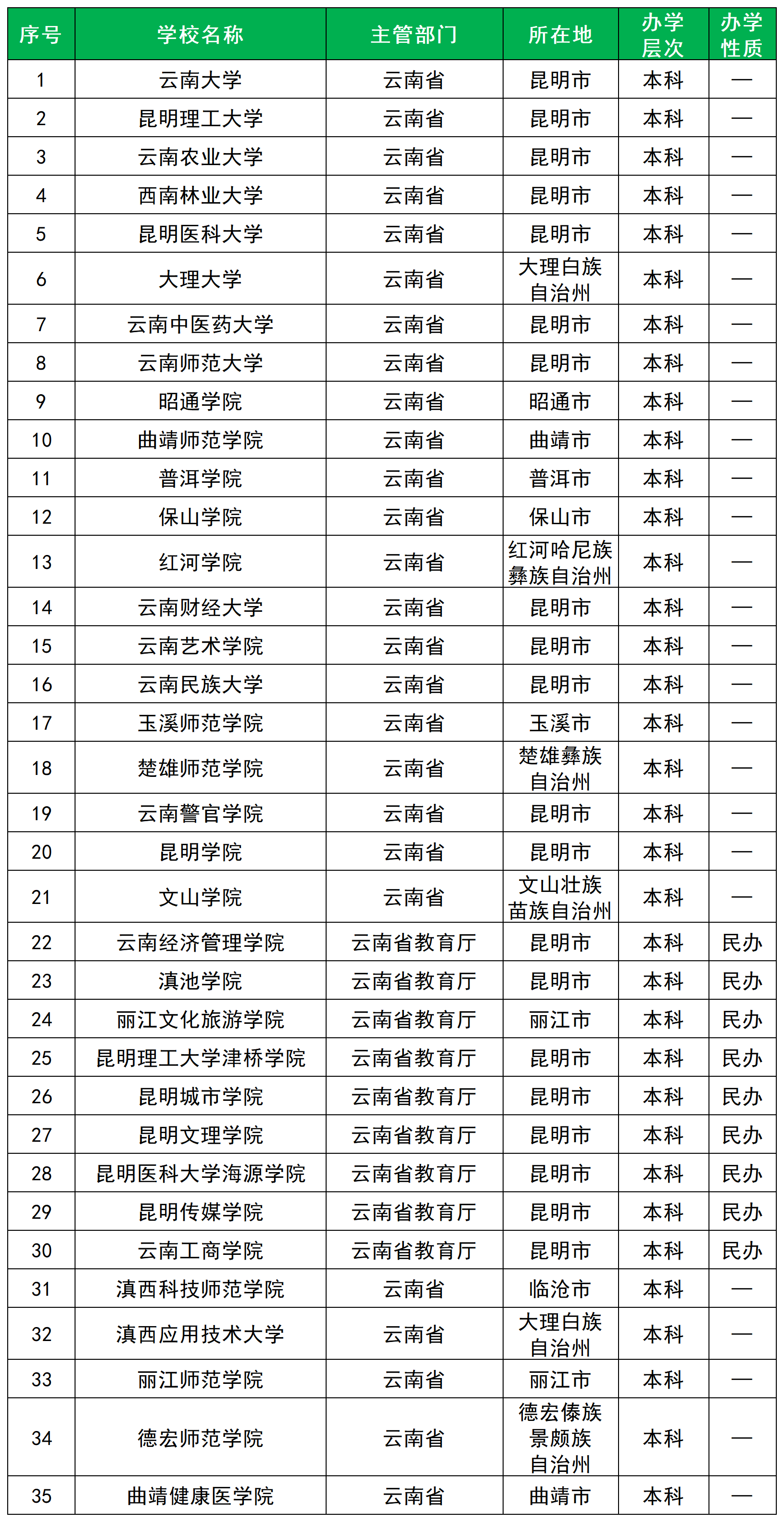 云南省内有35所本科大学,实力最强的是云南大学,其余知名度较高、学科实力较强的大学还有大理大学、云南农业大学、云南师范大学、昆明理工大学等院校。