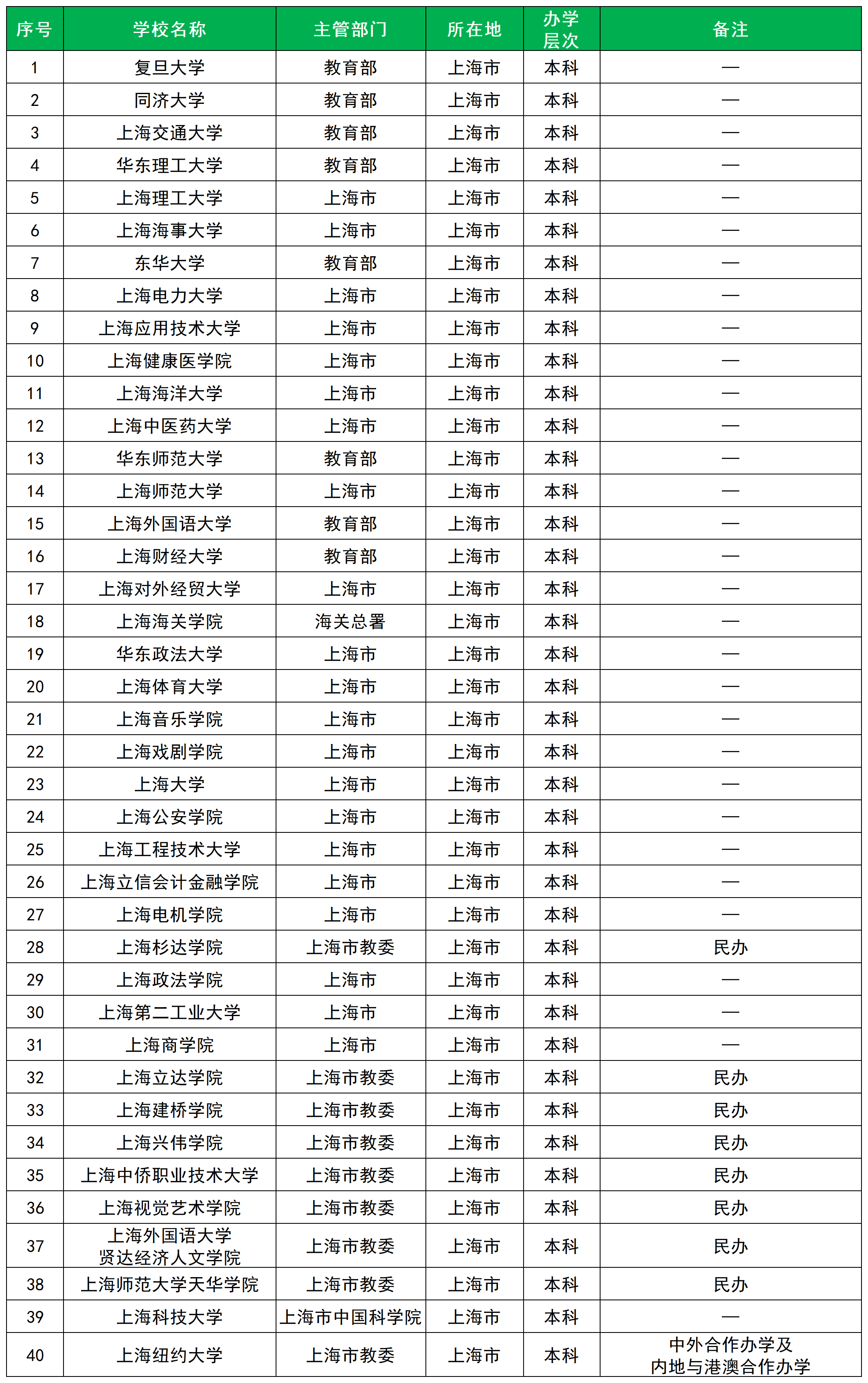上海市内有40所本科大学,拥有上海交通大学、复旦大学、同济大学、华东师范大学等985名校。此外,还有东华大学、上海外国语大学、上海大学、上海财经大学等211院校也坐落于此。