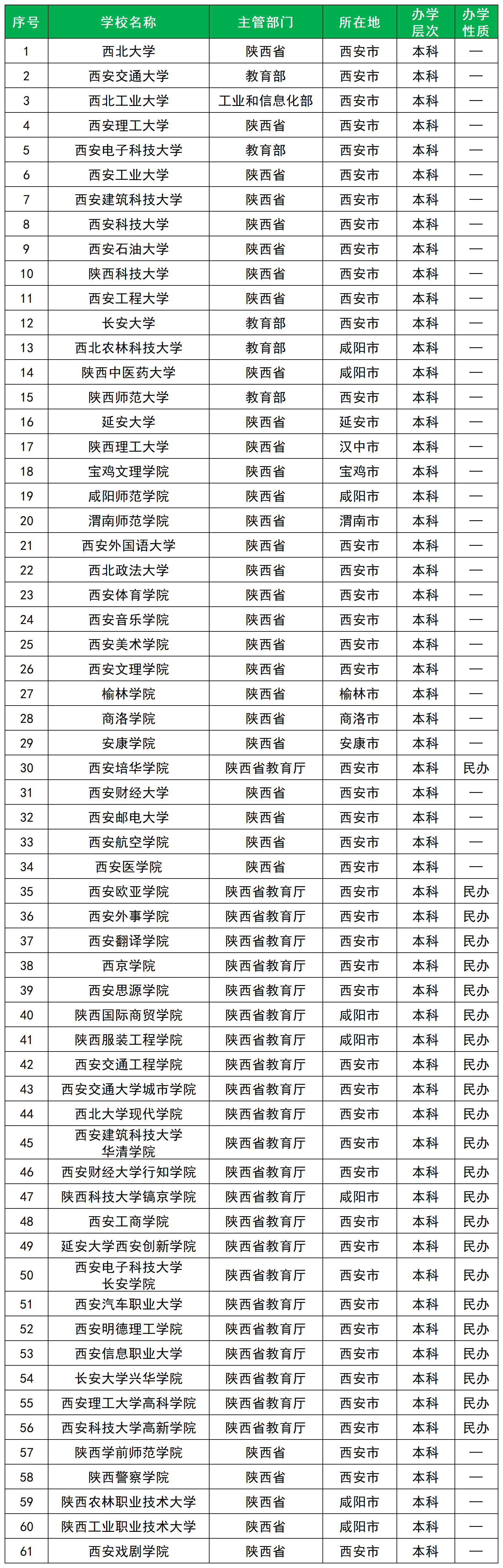 陕西共有61所本科大学,是西北地区高等教育资源最丰富的一个省份,省内有西北大学、西安电子科技大学、西安交通大学、西北工业大学、长安大学等名校。