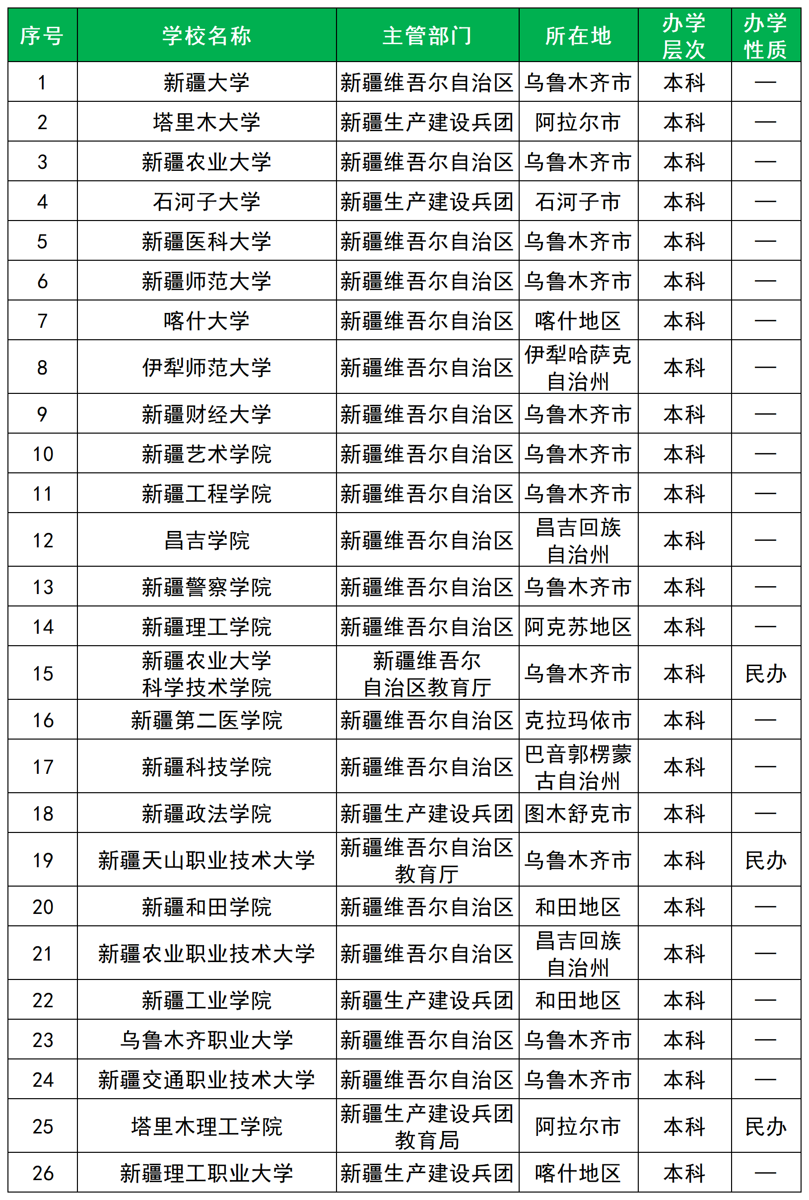 新疆共有26所本科大学,截止2025年6月20日,新疆的本科大学名单整理如下,供大家参考。