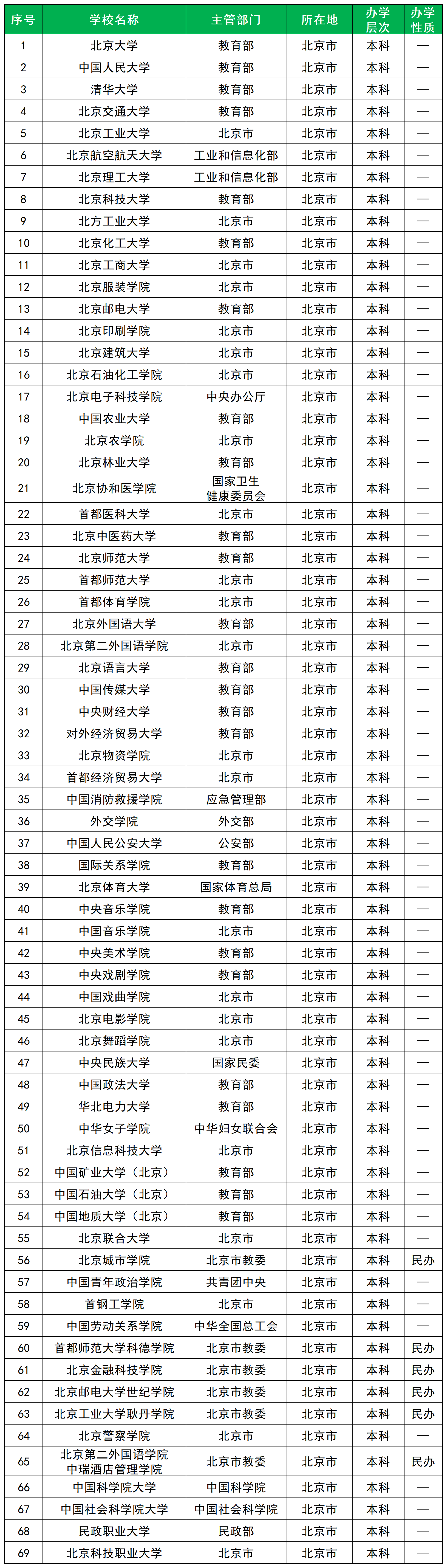 北京市内有69所本科院校,首都的高等教育资源非常丰富,大家所熟知的北京大学、清华大学均坐落于北京。