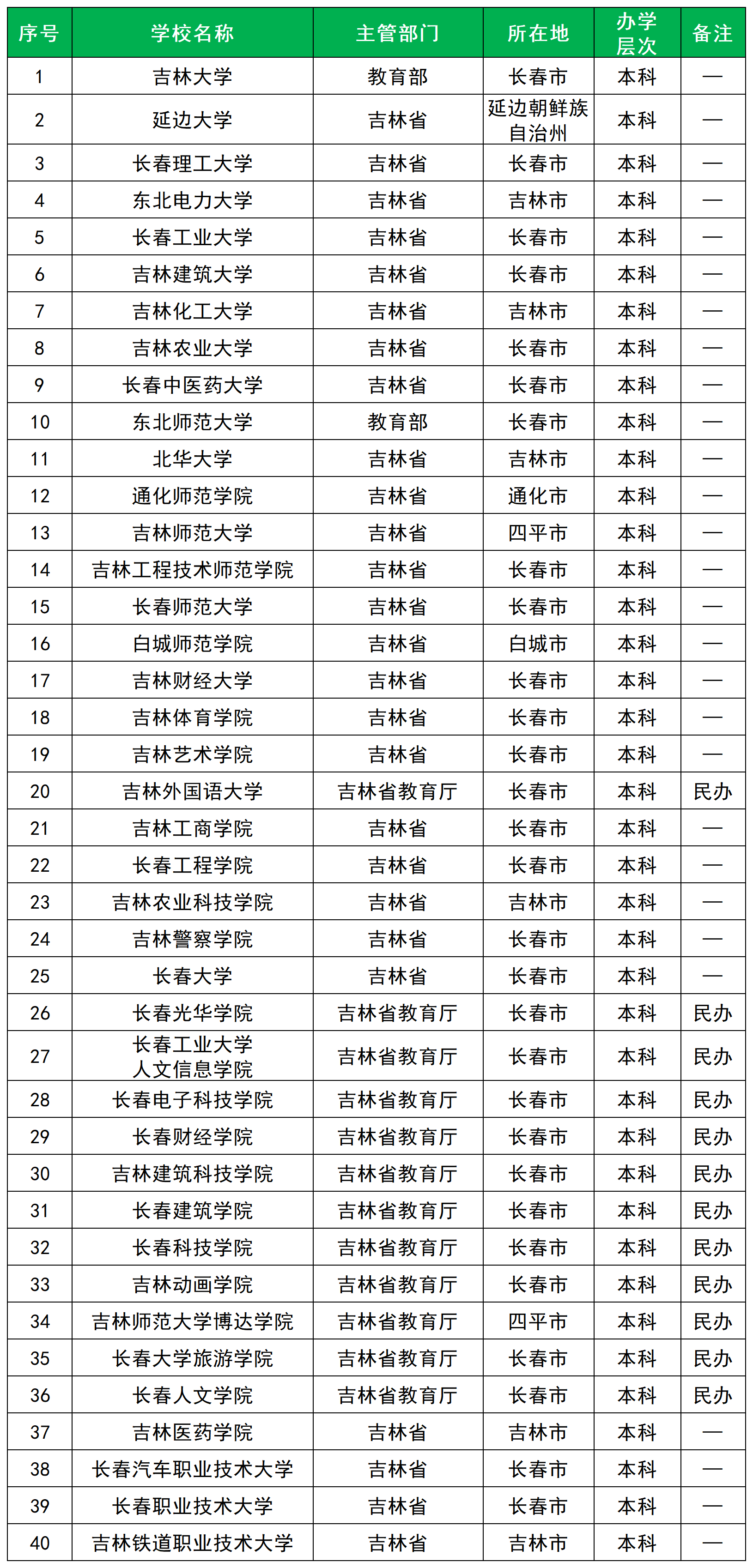 吉林省内共有40所本科大学,其中知名度较高的大学有吉林大学、延边大学、东北师范大学、东北电力大学等院校。