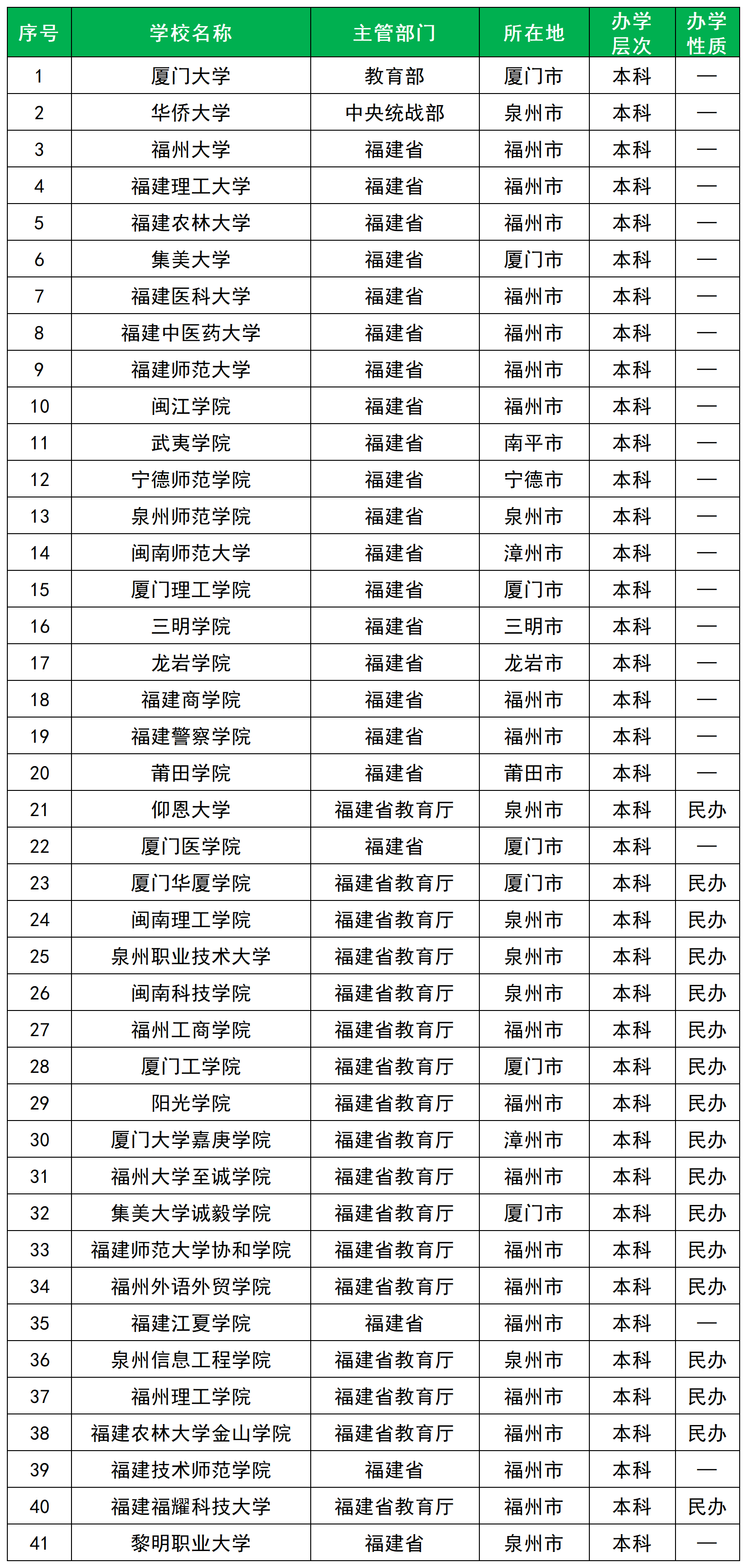 福建省内有41所本科大学,省内知名度较高的大学有厦门大学、华侨大学、福州大学、集美大学、福建理工大学等院校。