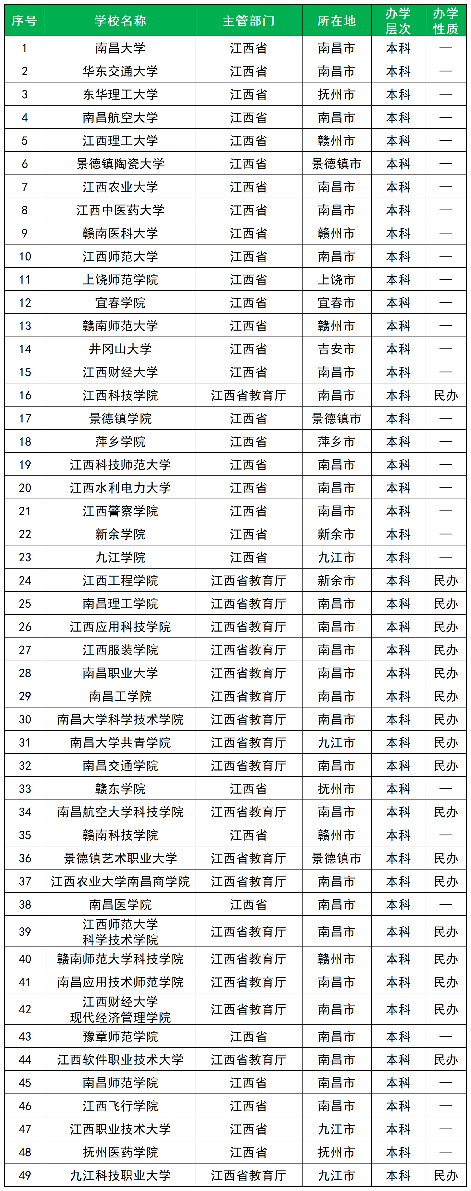 江西省内有49所本科大学,其中知名度较高的大学有南昌大学、华东交通大学、江西财经大学、江西理工大学等院校。