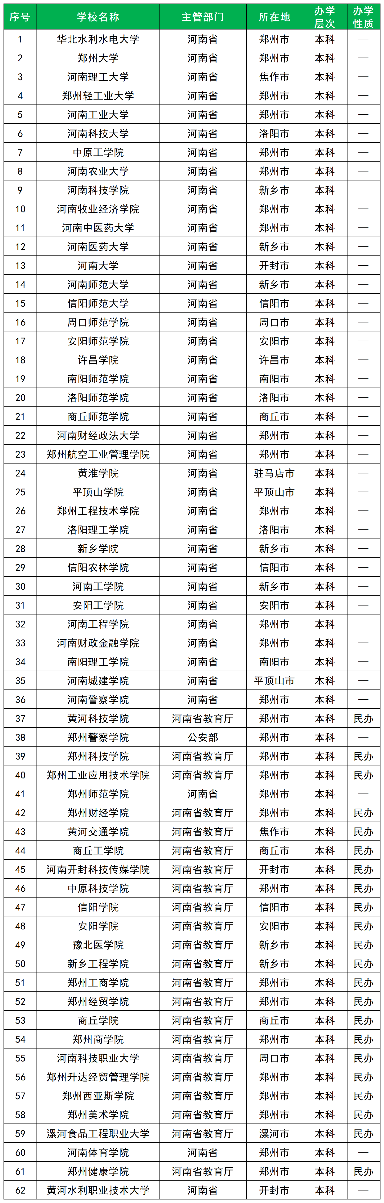 河南省内共有62所本科大学,虽然只有1所211大学——郑州大学,但其他知名度较高、实力较强的院校还有河南大学、河南理工大学、华北水利水电大学、河南科技大学等。