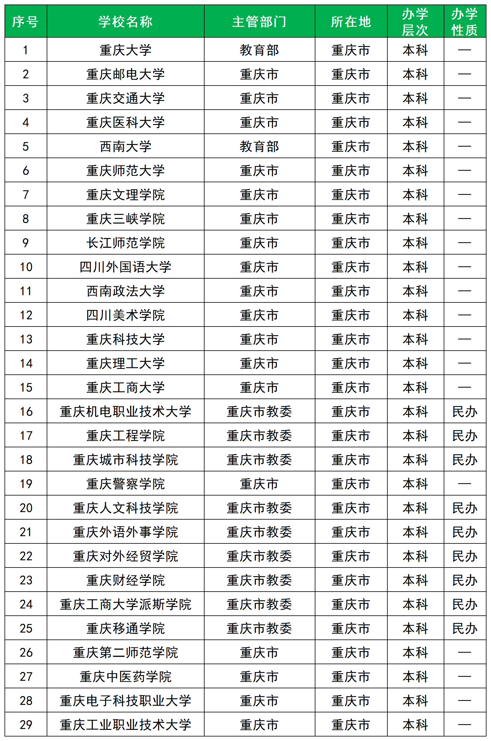 重庆共有29所本科大学,截止2025年6月20日,重庆的本科大学名单整理如下,供大家参考。