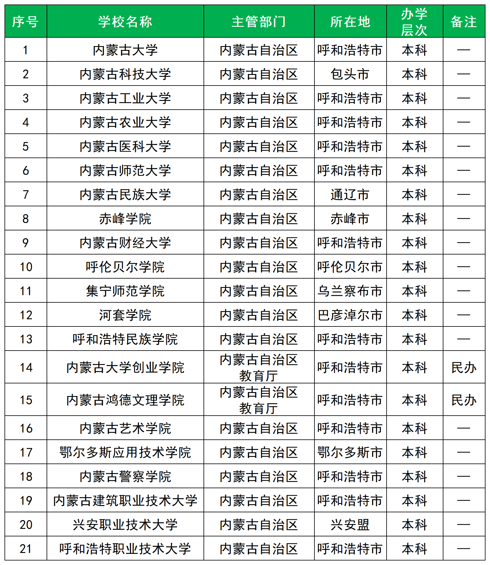 内蒙古共有21所本科大学,截止2025年6月20日,内蒙古的本科大学名单整理如下,供大家参考。