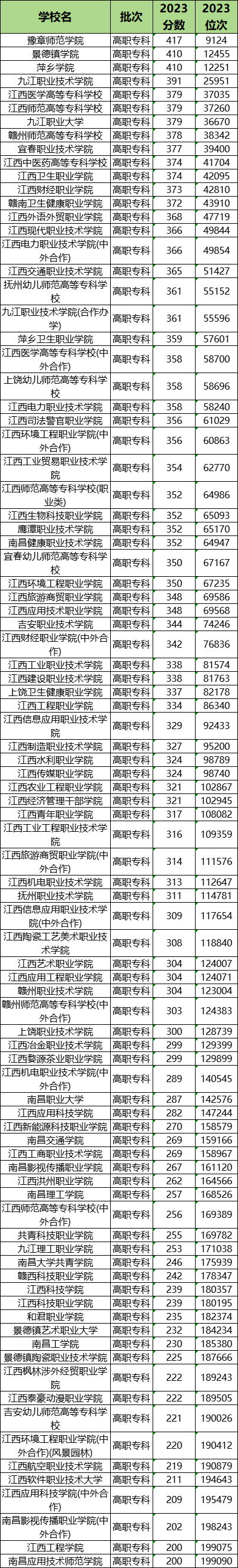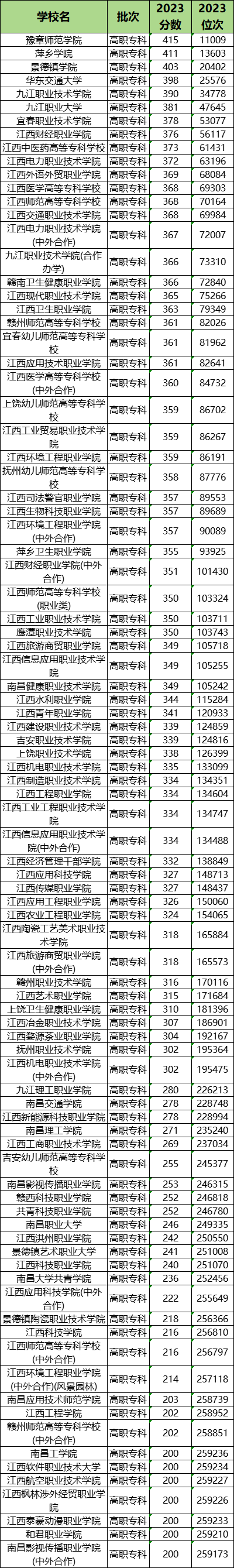 根据江西省教育考试院公布的数据,圆梦志愿为大家整理了江西省内所有专科批大学2023年在江西省理科的分数线排名汇总表。其中, 豫章师范学院在理科的分数线最高,2023年的最低分为415分、最低位次为11009名。