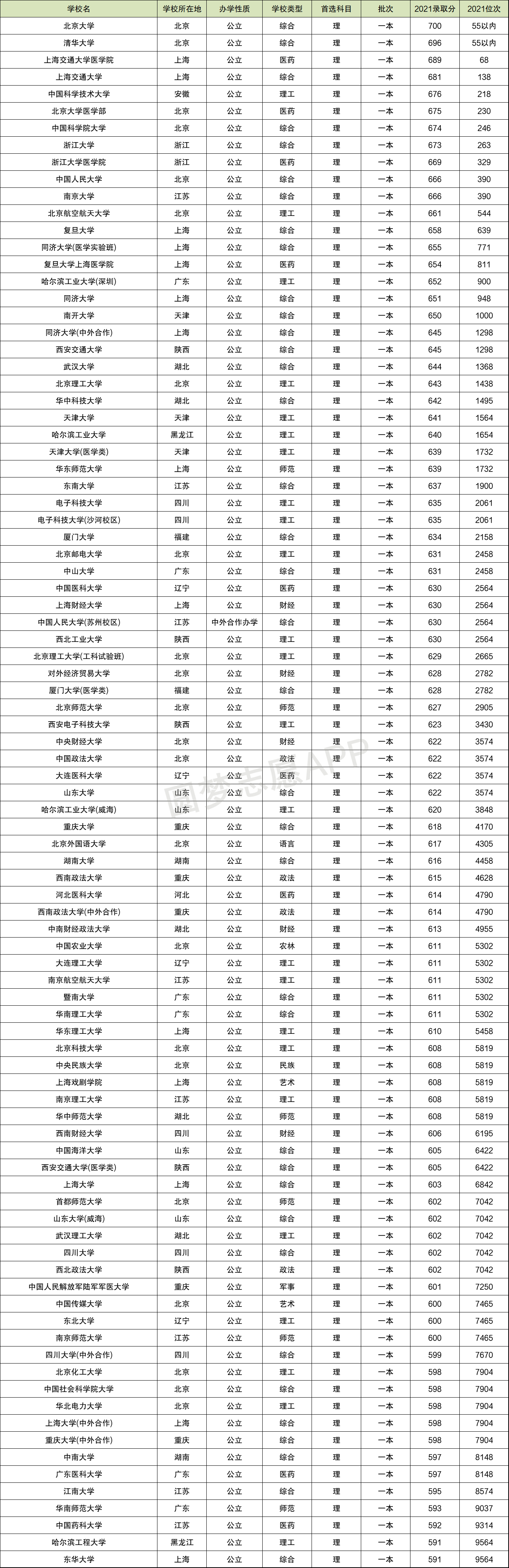在这个范围内,收分最高的是北京大学,最低位次为55位以内(目前实行高分保护政策,暂不公布高分考生具体位次),最低分为700分;收分最低的是东华大学、哈尔滨工程大学2所院校,最低位次为9564位,最低分为591分。