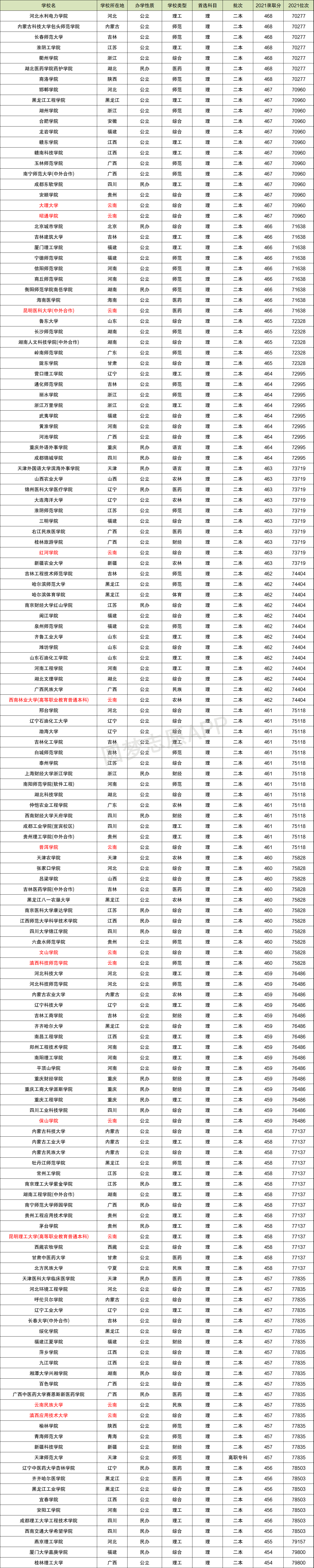 在这个范围内,收分最高的是河北水利电力学院、内蒙古科技大学包头师范学院等7所院校,最低位次为70277位,最低分为468分;收分最低的是塔里木大学、河西学院等7所院校,最低位次为79800位,最低分为454分。