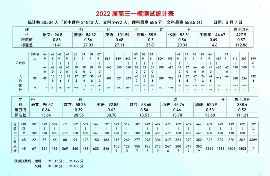 2022年参加此次考试的人数共计30504人,其中理科占了2/3。根据分数段位次表显示,理科一本上线人数应该在4821人~5489之间,而文科一本上线人数为1280人,高分位次差距还是比较大。