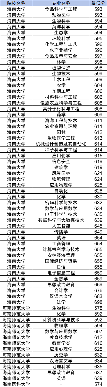 2024年地方专项计划各个大学分数线海南省一览表如下:
