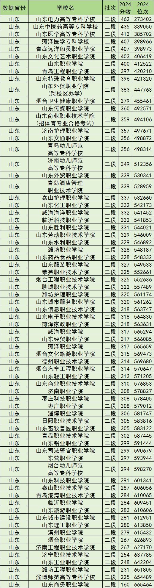 下面是2024年山东省公办大专院校分数线排名一览表: