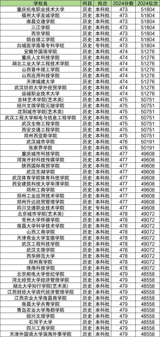 河北高考历史类5万名左右能报考的大学中位次排名较低的有重庆机电职业技术大学、福州大学至诚学院、南昌交通学院、三江学院等,2024年最低分473分,对应排名是51804名。另外最接近5万名的是武汉城市学院、张家界学院,2024年最低分476分,排名是50191名。