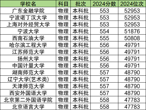 河北高考物理类5万名左右能报考的大学中位次排名较低的有广东金融学院、宁波诺丁汉大学、上海对外经贸大学,2024年最低分553分,对应排名是52953名。另外最接近5万名的是西南石油大学,2024年最低分555分,排名是50808名。