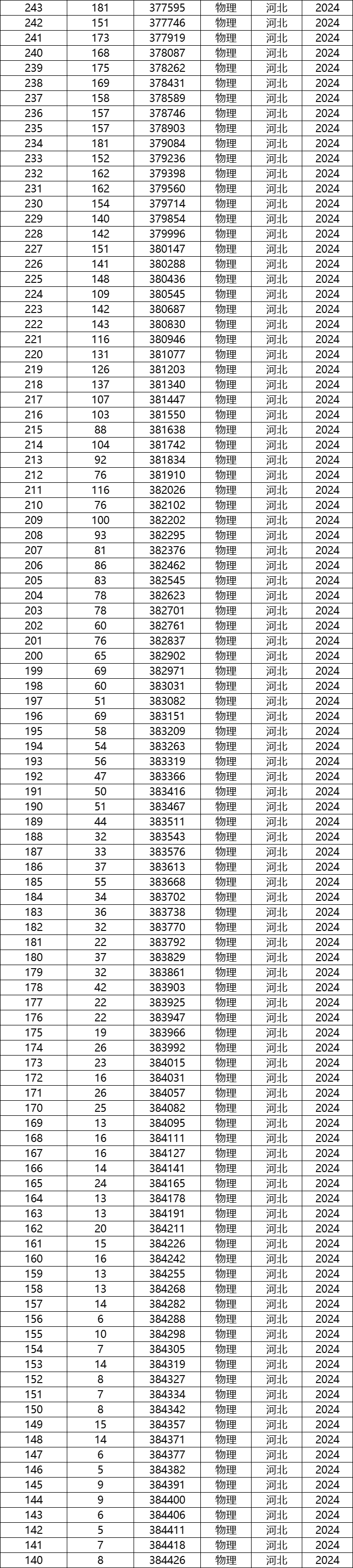 河北2024年高考排名表显示:物理类本科最低分排名337011、历史类本科最低分排名126308。位次对应大学方面:物理类50808名对应西南石油大学、历史类50191名对应武汉城市学院。完整版一分一段表及更多位次对应大学如下文所示。