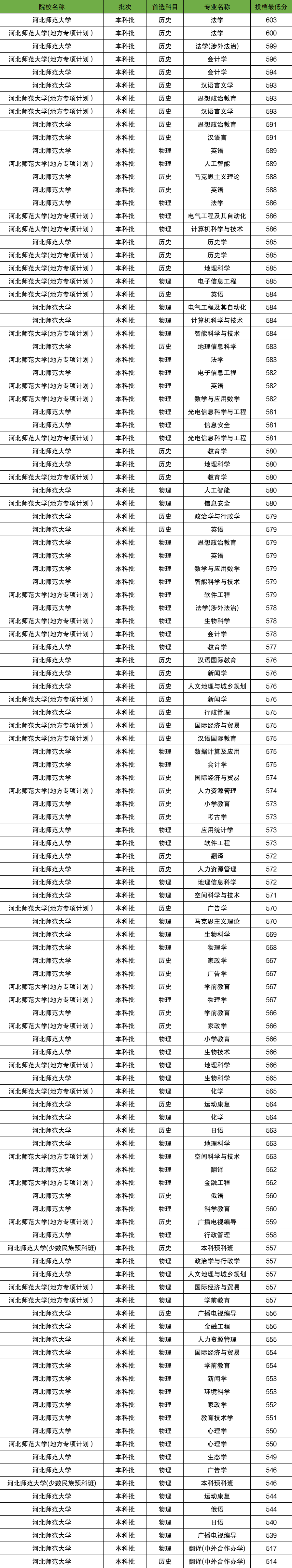 2025年河北师范大学在省内招生最低分数范围为514分-603分,各科类最低分详情如下:
