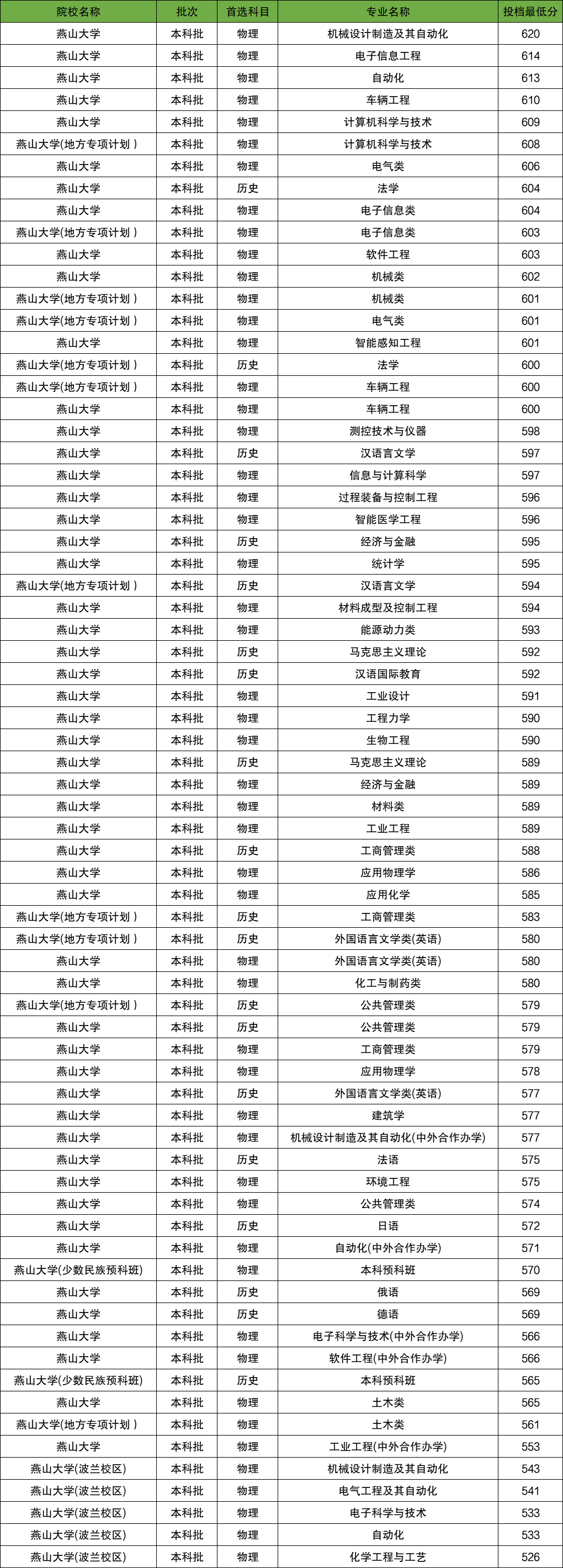 2025年燕山大学在省内招生最低分数范围为526分-620分,各科类最低分详情如下: