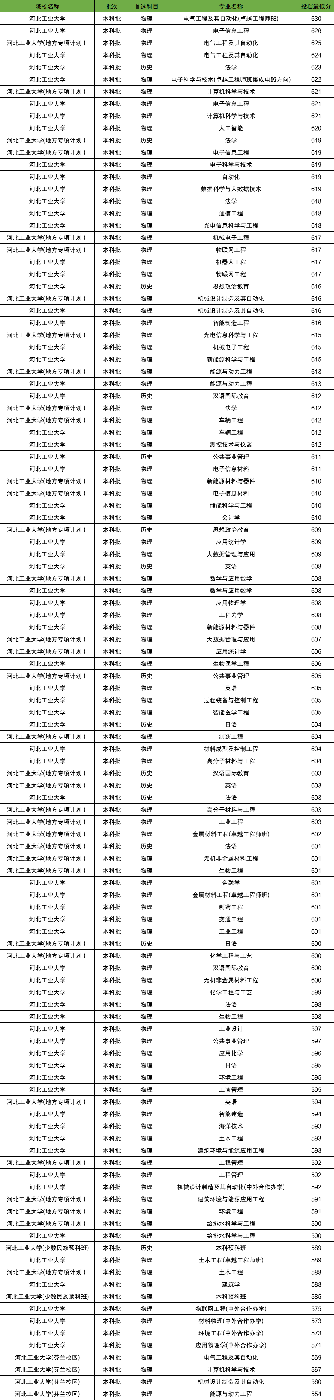 2025年河北工业大学在省内招生最低分数范围为554分-630分,各科类最低分详情如下: