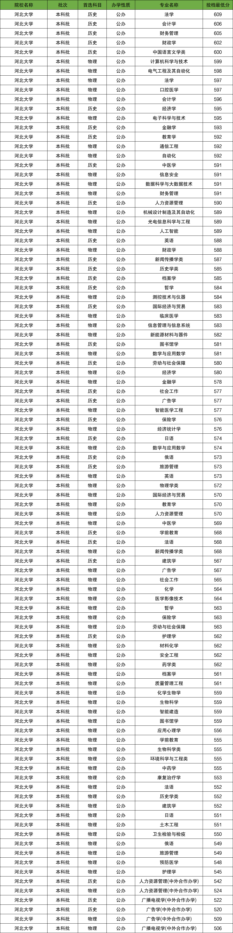 2025年河北大学在省内招生最低分数范围为506分-609分,各科类最低分详情如下: