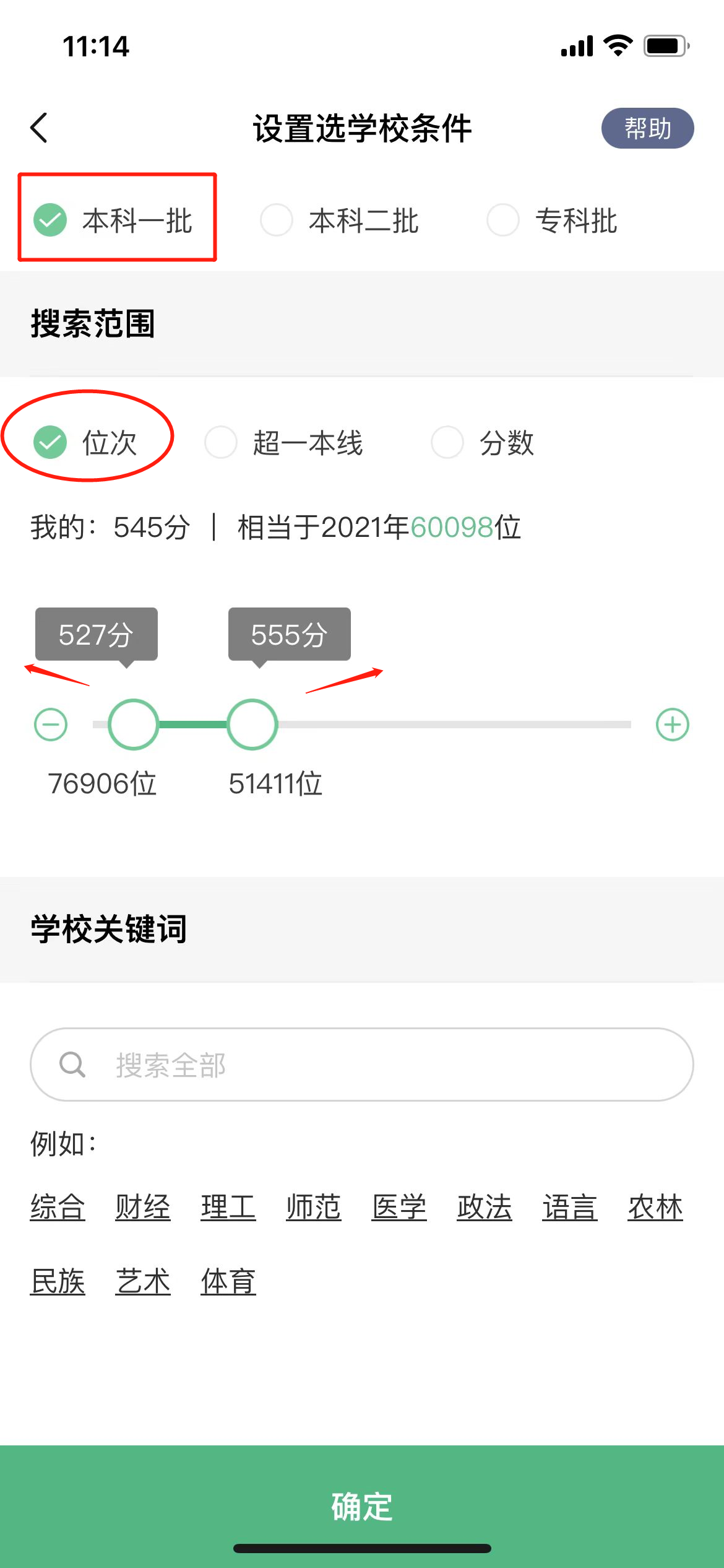 考生还可点击想要了解的本科一批、二批或者专科批次,分数区间可根据考生想要了解的滑动。