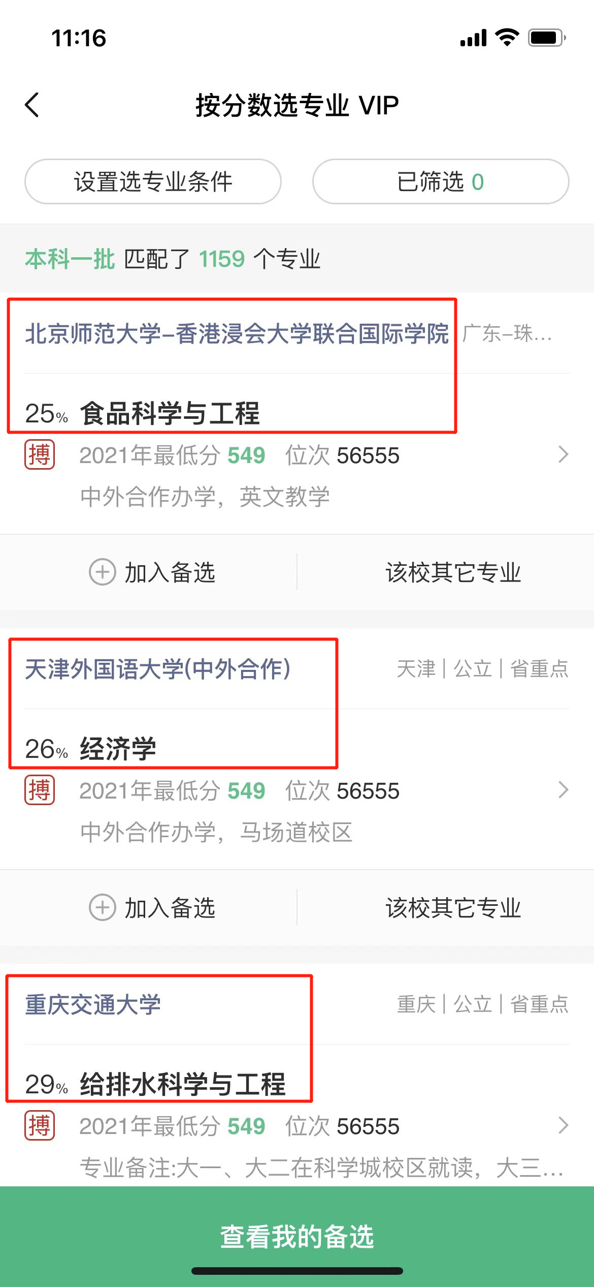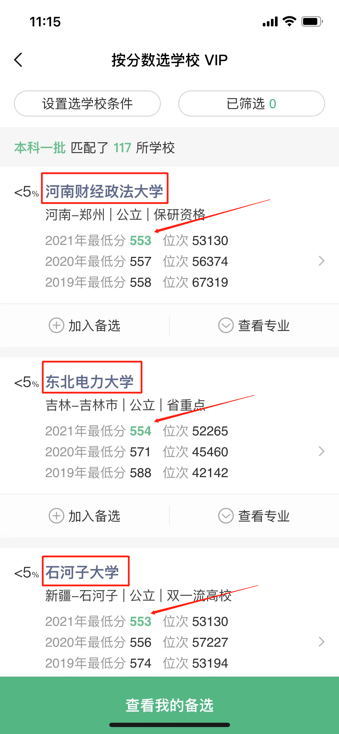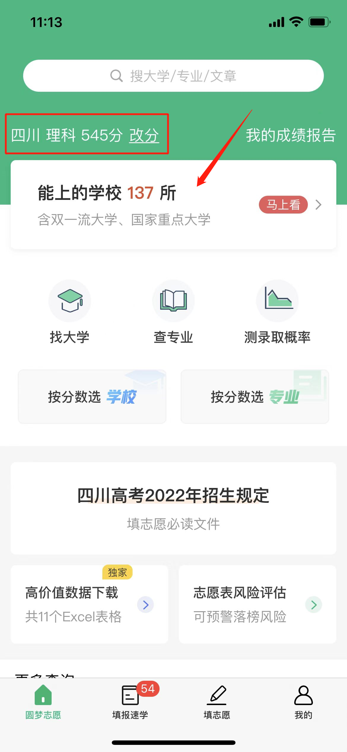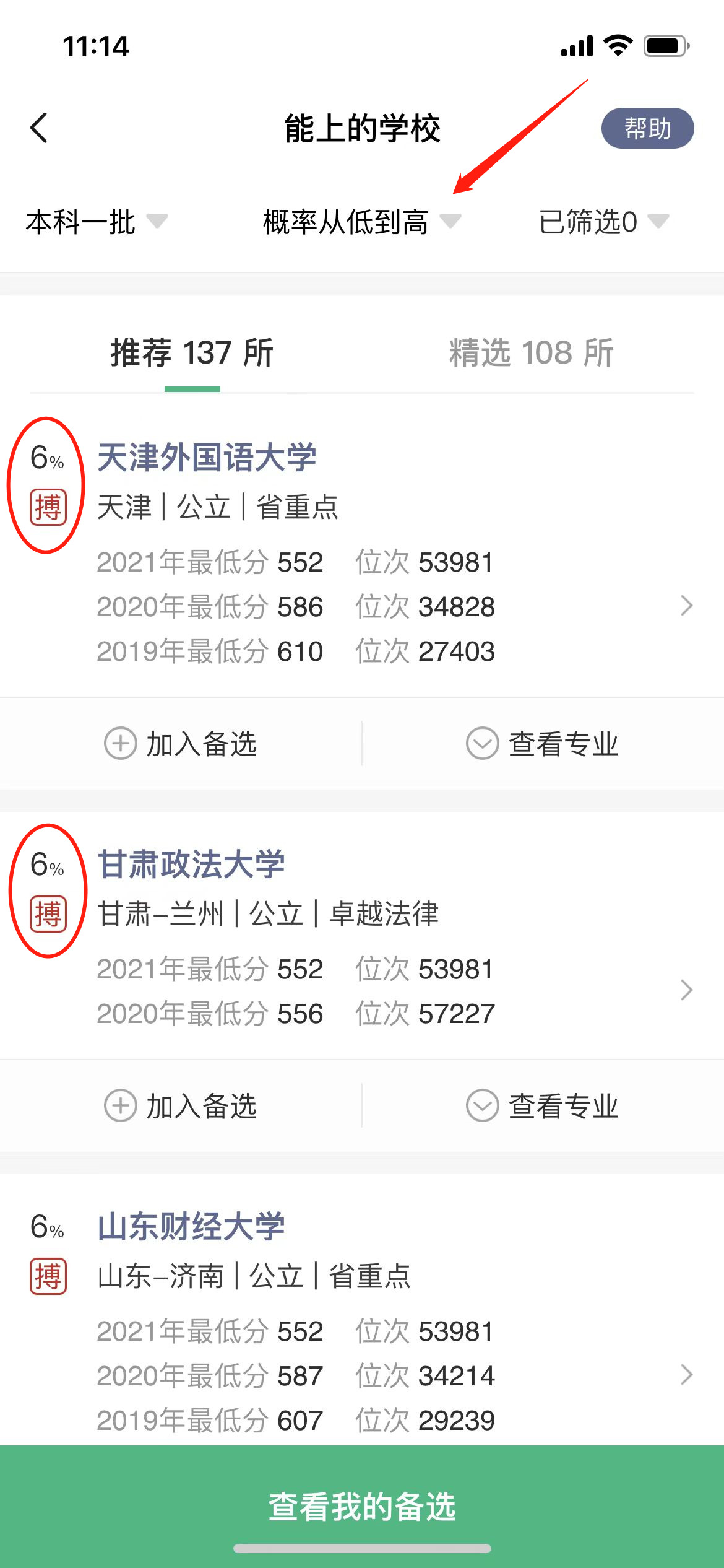 点击概率从低到高或分数从高到低,这时候同学们就可以看到自己的分数能上的所有大学。