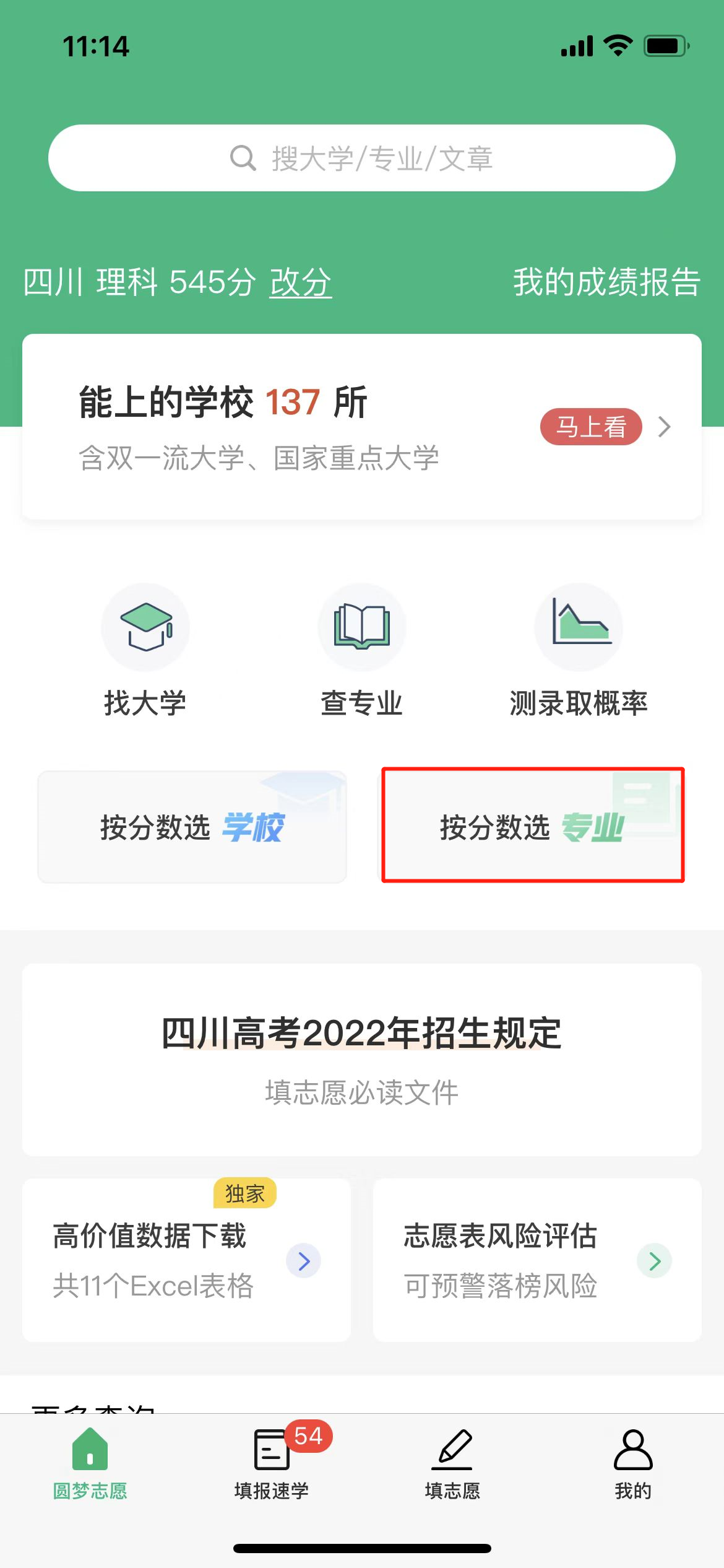 如果考生想了解自己的分数可以上哪些专业,可点击“按分数选专业”