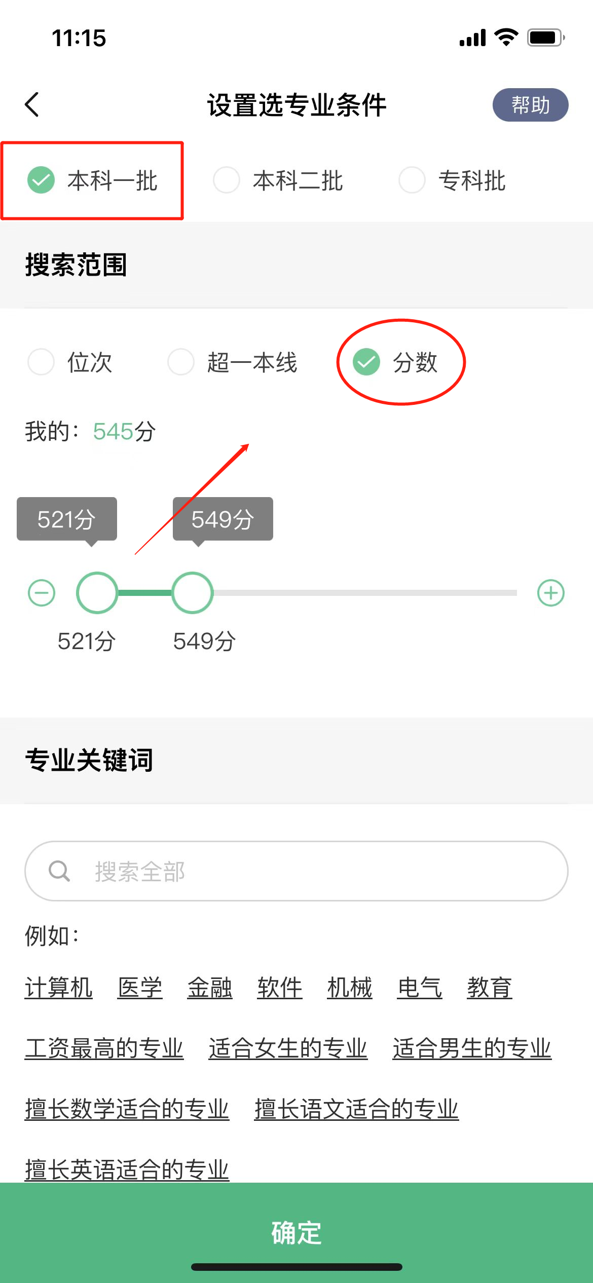 ③设置分数区间,筛选对应的专业