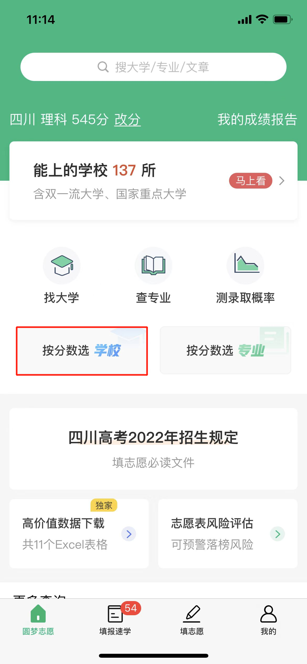 如果同学们只想查看某一分数段的大学,则可点击“按分数选学校”