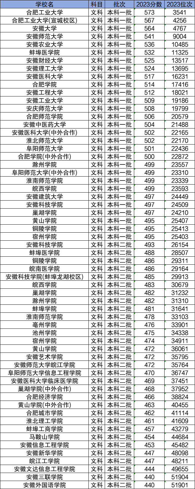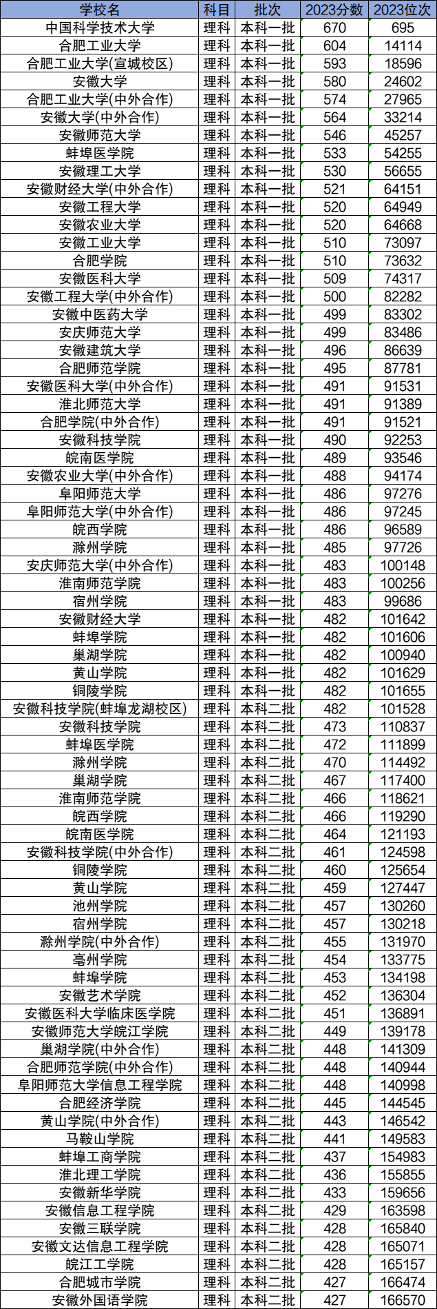 由于每年在高考前后,都有很多同学对于各省的高校录取分数线十分感兴趣,因此以下是小编以2023年的数据为例,为大家整理的安徽省内的高校在本科批次的收分情况。