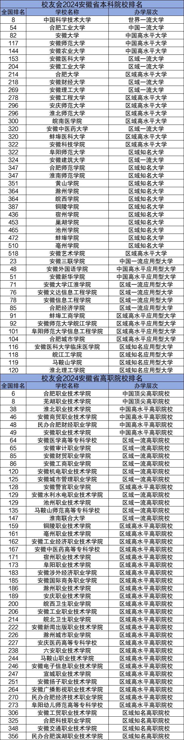 根据校友会最新排名显示,目前安徽省共有91所大学院校,其中本科院校共有46所,高职院校共有45所。本科院校中不乏有部分省内重点高校深受同学们的欢迎,比如合肥工业大学、安徽大学、安徽师范大学、中国科学技术大学等,这些大学的综合实力排名都位于安徽省内前列,其学科实力和科研成果都是在国内享有盛誉的。