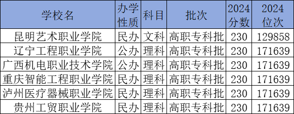 文科230分能上的大学有昆明艺术职业学院;理科230分能上的大学有辽宁工程职业学院、广西机电职业技术学院、重庆智能工程职业学院、泸州医疗器械职业学院、贵州工贸职业学院。