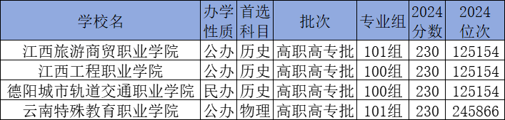 历史类230分能上的有江西旅游商贸职业学院、江西工程职业学院、德阳城市轨道交通职业学院;物理类230分能上的有云南特殊教育职业学院。