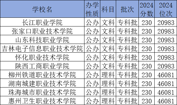 文科230分能上的大学有长江职业学院、张家口职业技术学院、山东科技职业学院、吉林电子信息职业技术学院、怀化职业技术学院等;理科230分能上的大学有柳州铁道职业技术学院、湖南城建职业技术学院、珠海城市职业技术学院、惠州卫生职业技术学院。